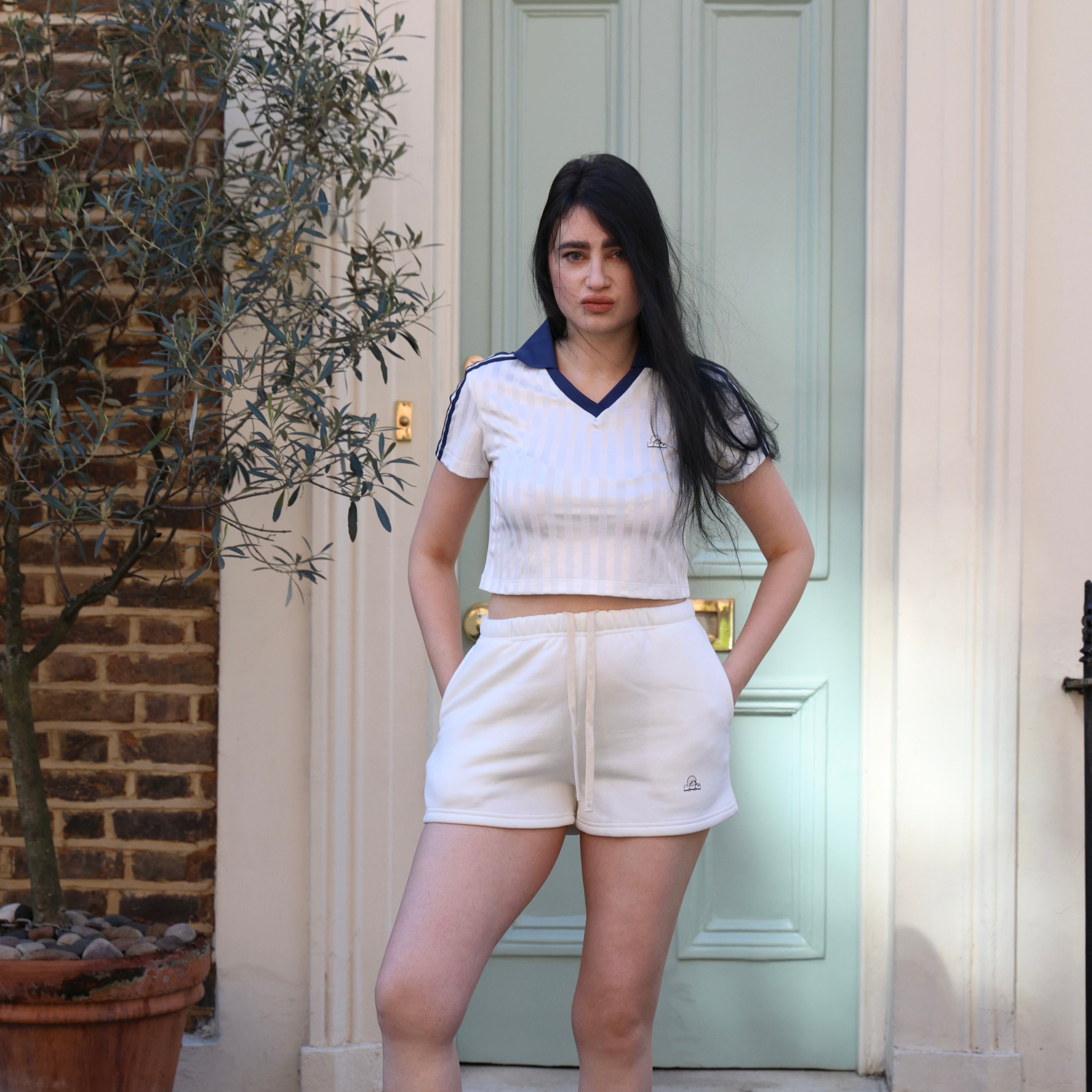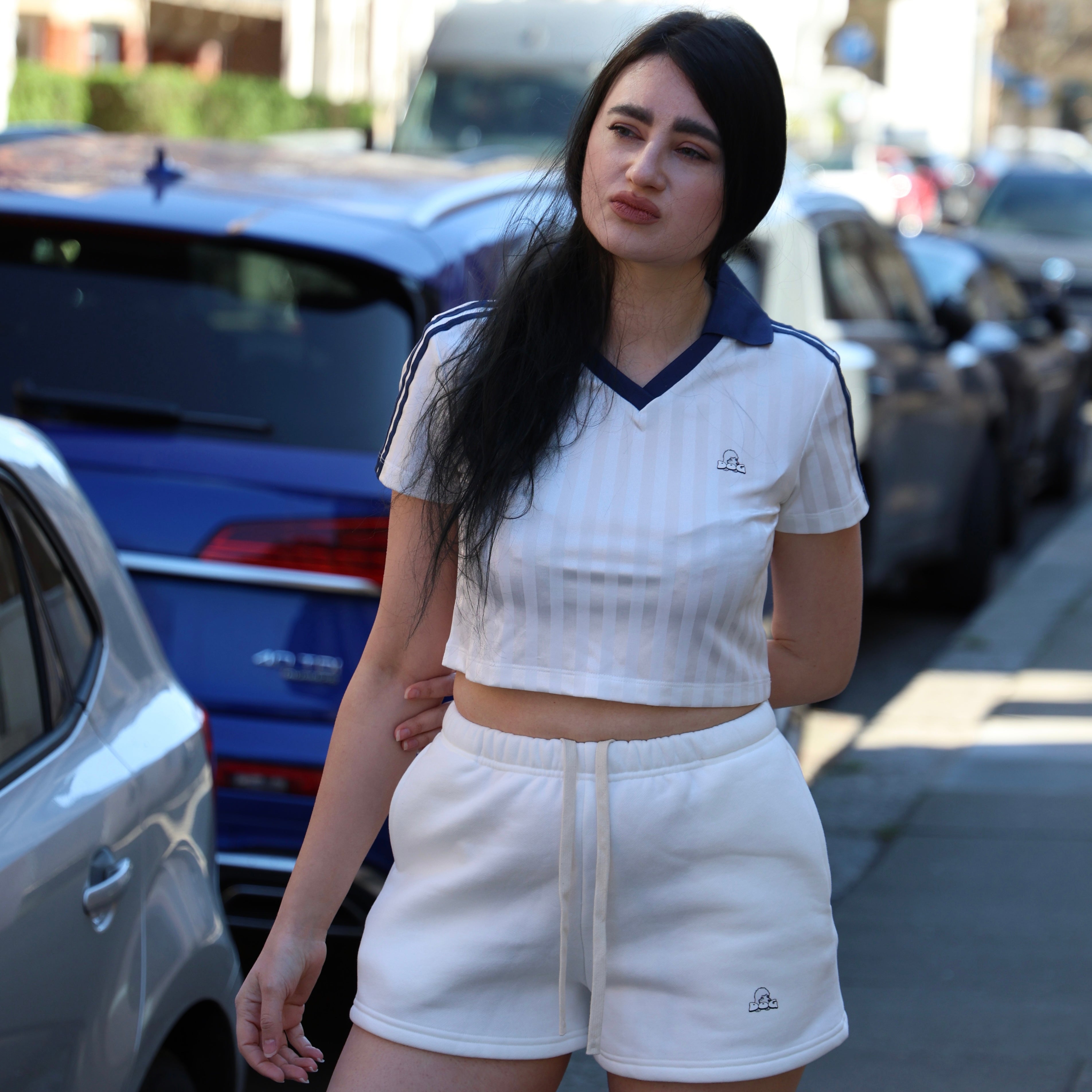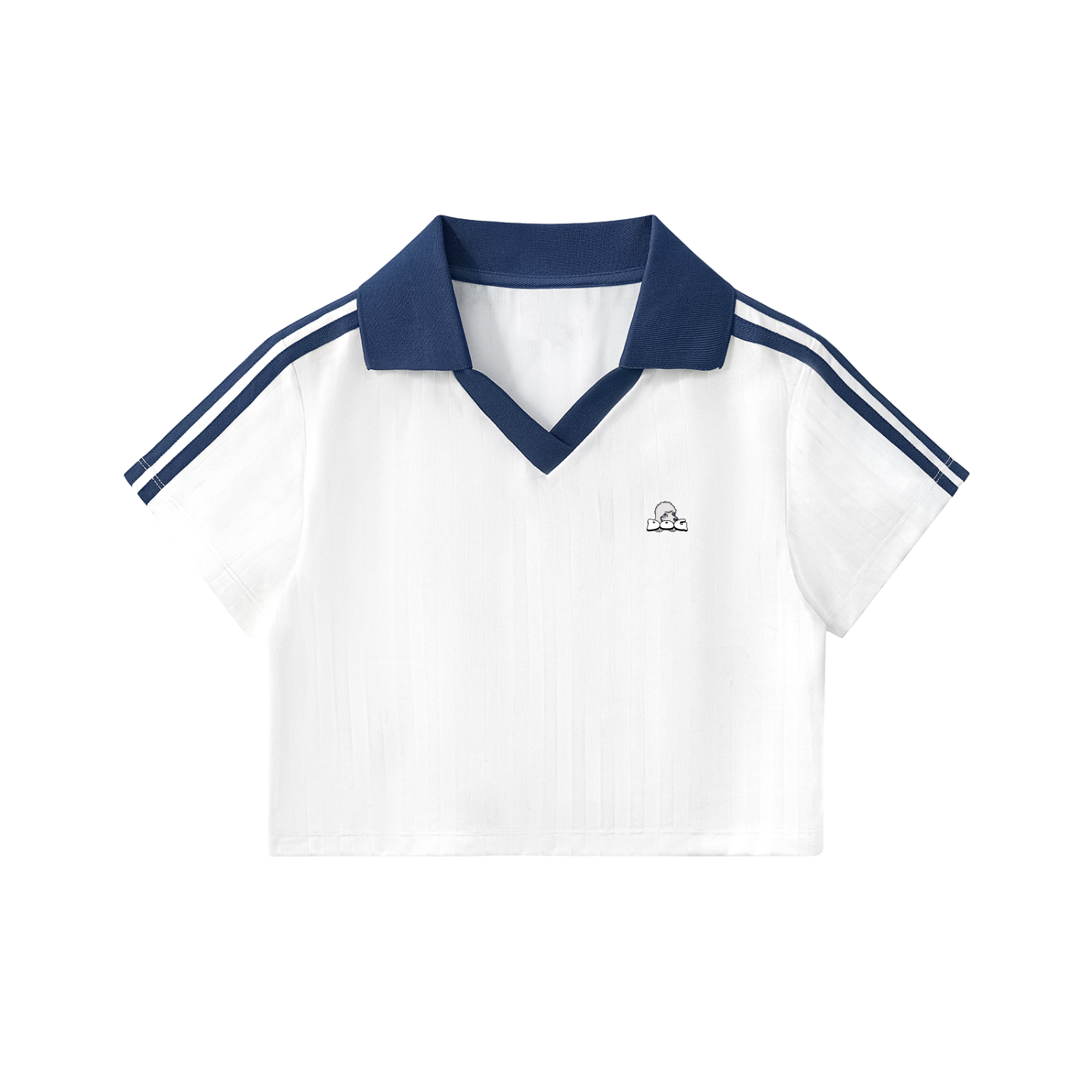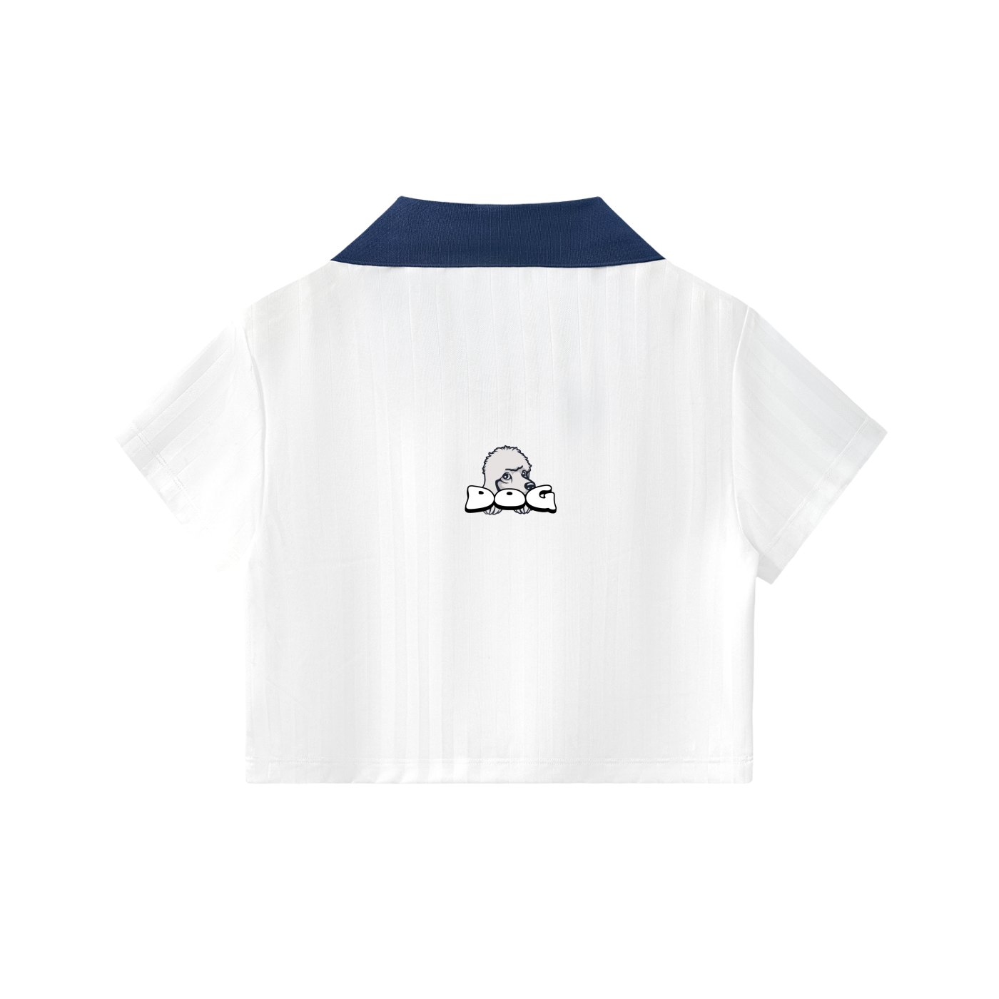 The Miss DOG Court Polo draws from classic sport silhouettes and refines them into something sharper. A structured collar, clean stripe detailing, and a cropped, relaxed fit create a piece that sits between performance and presence.