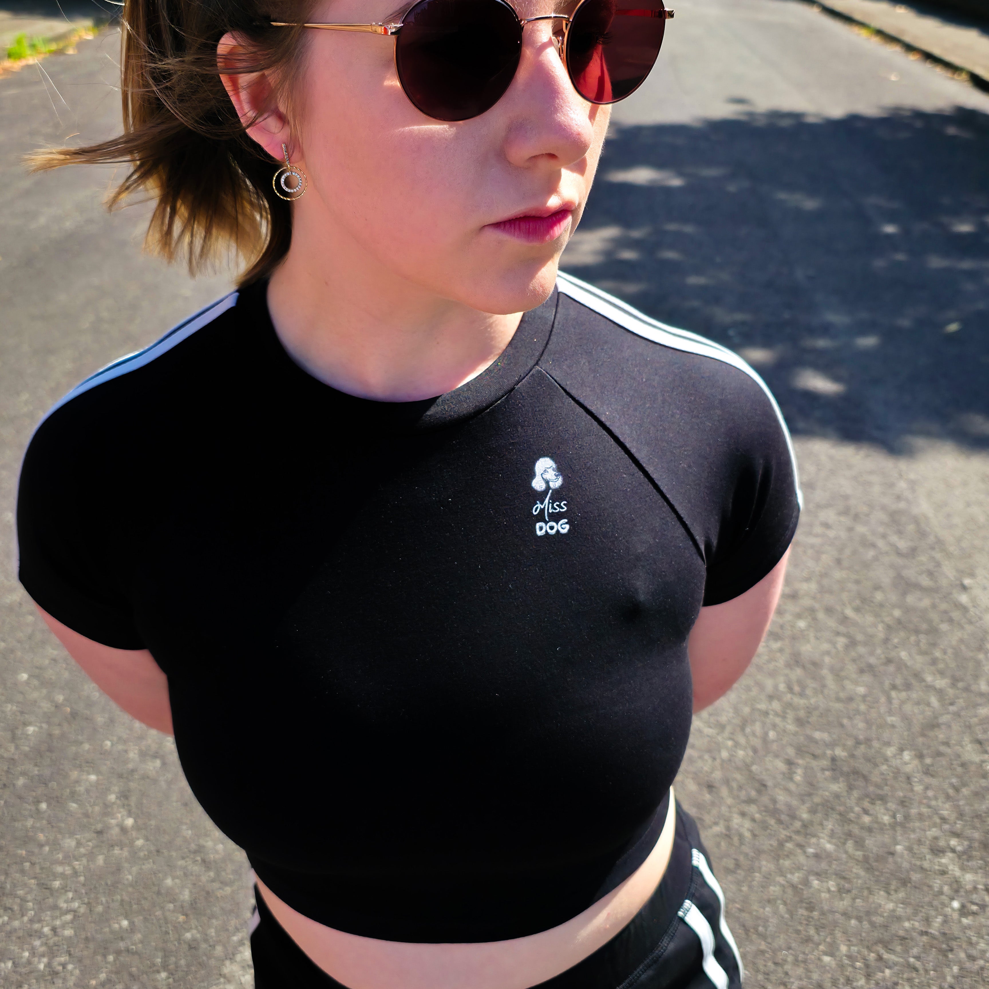 The clean black body is framed with crisp double racing stripes along the shoulders, giving it that athletic edge, while the Miss DOG emblem sits proudly on the chest — a mark of quiet dominance.